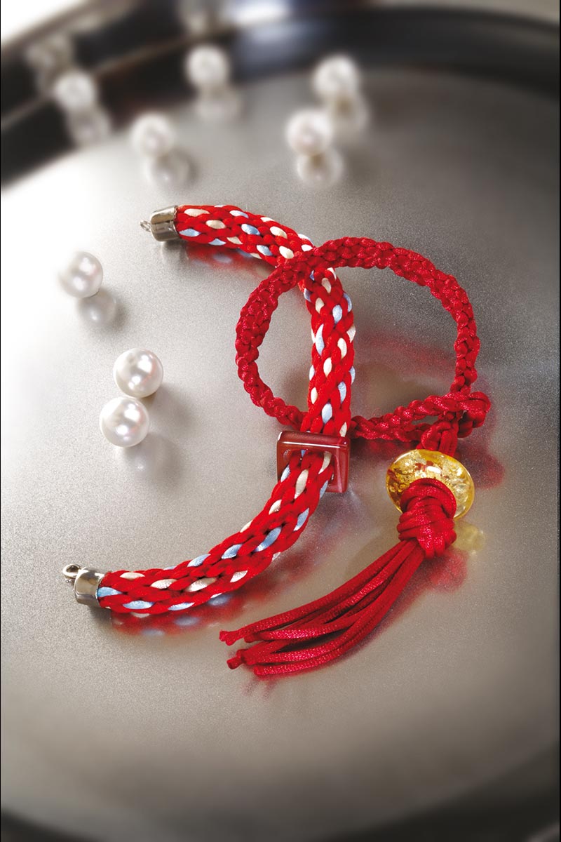 Das knüpfen ist recht einfach: Das platte armband wird aus fünf fäden auf der viereckigen scheibe .